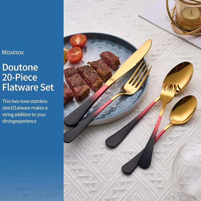 20-Piece Black Red Gold Silverware Set, 18/0 Stainless Steel Colorful Handle Flatware Set,Service for 4,Modern Cutlery Set Includes Dinner Knives Forks Spoons,Mirror Polished,Dishwasher Safe