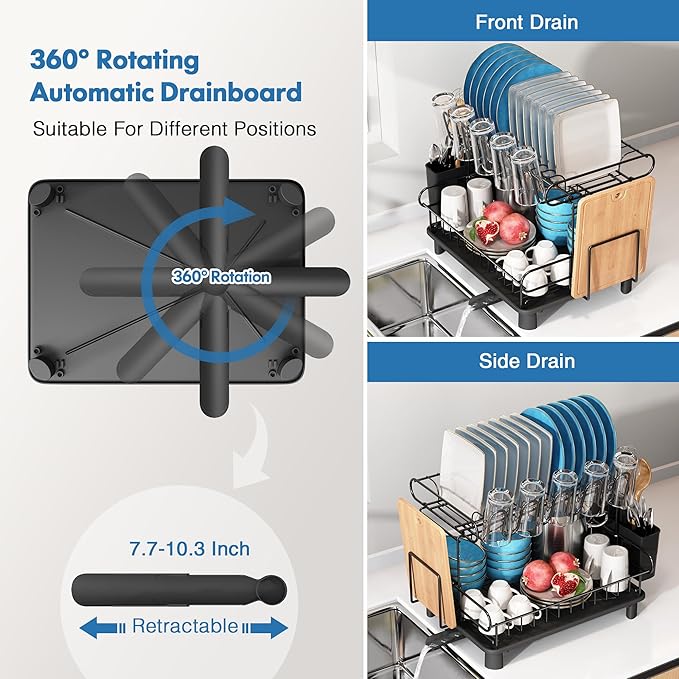 - Automatic Drainage Design: This dish strainers for kitchen counter comes with a central drain hole, ensuring that water flows directly into the sink The swivel spout can rotate 360°, so you can place the dish rack in the best position next to the sink as needed.