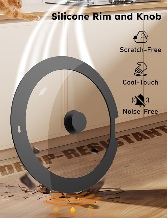 - DROP-RESISTANT GLASS LIDS: This non-stick cookware set includes two tempered glass lids with food-grade silicone rims for a secure, noise-free, and drop-resistant seal. The durable, shatter-resistant glass lets you monitor your cooking without lifting the lid. Cool-Touch silicone knobs stand upside down for added convenience, while four anti-slip bumps keep the lids securely in place to ensure safe, stable cooking every time