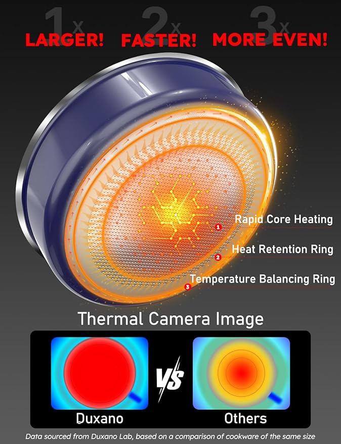 - 1X LARGER, 2X FASTER, 3X MORE EVEN: This Pots and pans features a larger heat-sensitive base with a 3-ring design for optimal heat distribution: Rapid Heating Core, Heat Retention Ring, and Temperature Balancing Ring. The advanced 3-ring system enhances heat uniformity by 3 times, effectively eliminating hot or cold spots for better cooking results. Additionally, the thick, anti-warp base allows ample time for preheating, so you can cook without rushing