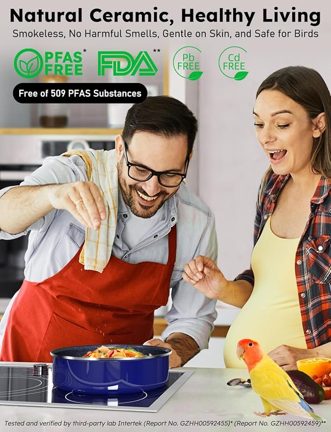 - FREE OF 509 PFAS TYPES & NON-TOXIC: Independently tested by Intertek, this detachable handle pots and pans set is verified to be free of 509 known PFAS substances (Report No. GZHH00592455). It also meets FDA standards (Report No. GZHH00592459). Made with food-grade and natural materials, it delivers a smokeless, odor-free cooking experience that’s gentle on skin and safe for birds, children, and pregnant women. It’s also an eco-friendly choice for a more sustainable lifestyle