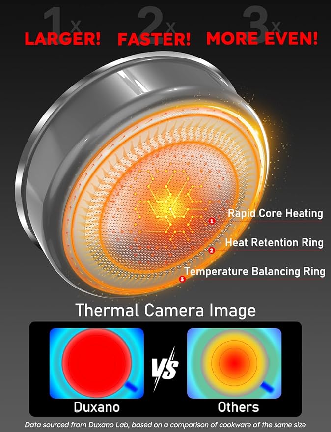 - 1X LARGER, 2X FASTER, 3X MORE EVEN: This Pots and pans features a larger heat-sensitive base with a 3-ring design for optimal heat distribution: Rapid Heating Core, Heat Retention Ring, and Temperature Balancing Ring. The advanced 3-ring system enhances heat uniformity by 3 times, effectively eliminating hot or cold spots for better cooking results. Additionally, the thick, anti-warp base allows ample time for preheating, so you can cook without rushing