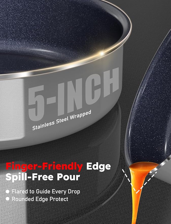 - DROP-RESISTANT GLASS LIDS: This non-stick cookware set includes two tempered glass lids with food-grade silicone rims for a secure, noise-free, and drop-resistant seal. The durable, shatter-resistant glass lets you monitor your cooking without lifting the lid. Cool-Touch silicone knobs stand upside down for added convenience, while four anti-slip bumps keep the lids securely in place to ensure safe, stable cooking every time