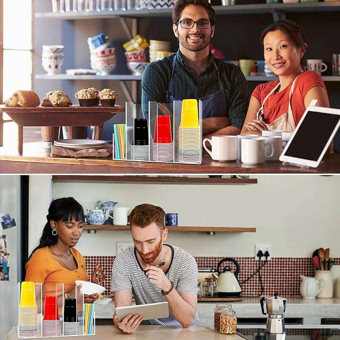- 【Versatile Multi-Use Storage】Holds paper cups, plastic cups, coffee cups, lids, straws, and more! Perfect for restaurants, lounges, coffee bars, buffets, home kitchens, and countertops – the ultimate cup and lid organizer for any space