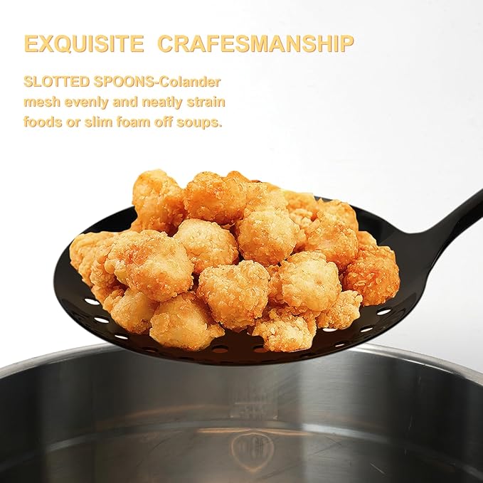 3-Piece Cooking Utensils Set Stainless Steel Large Serving Spoons Set Slotted Spoon Spatula Turner Skimmer Commercial and Residential Use Dishwasher Safe, Black