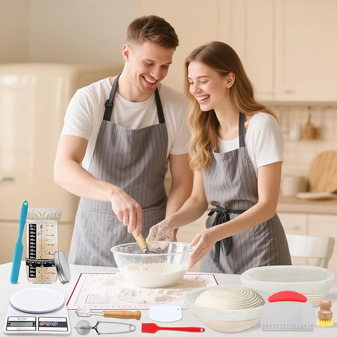 - 【Sourdough Bread Baking Supplies】Our bread making tools kit includes 10" round & oval bread bowls with liners, 24 oz sourdough starter jar kit, scale, bread bags, whisk, scrapers, sling, mat, lame, stencils & more. Perfect for joyful, easy baking anytime!