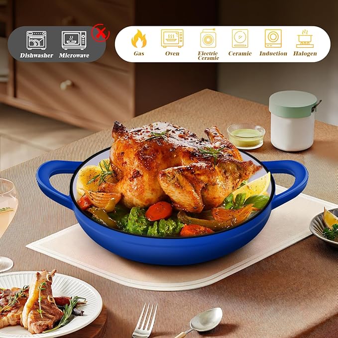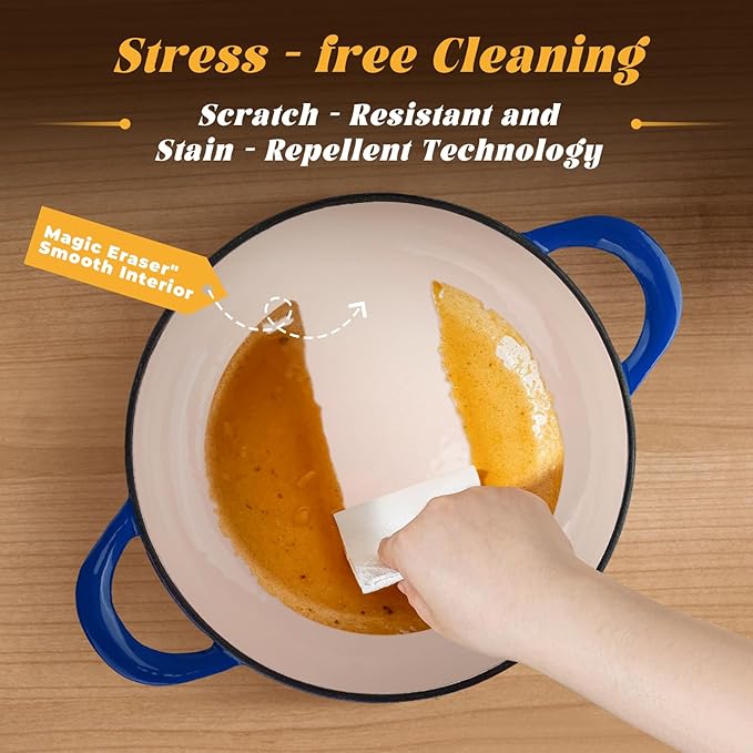 - Stunning Gradient Color & Ergonomic Design:Elevate your kitchen with a vibrant gradient blue or red finish. Features cool-touch phenolic handles for safe handling, and the unique wide base maximizes dough expansion. Flawless enamel interior resists staining