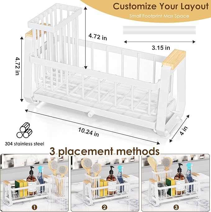 - 【Small Footprint Max Space】Our kitchen countertop organizer has upgraded the height of the brush rack storage part and adopts a unique engineering design. It measures only 10.24"*4"*6.88",the same size can hold 30% more capacity than standard racks,and can flexibly hold more detergent bottles ,types of brushes and other items. No more choosing between‘sponges or detergents’like others!