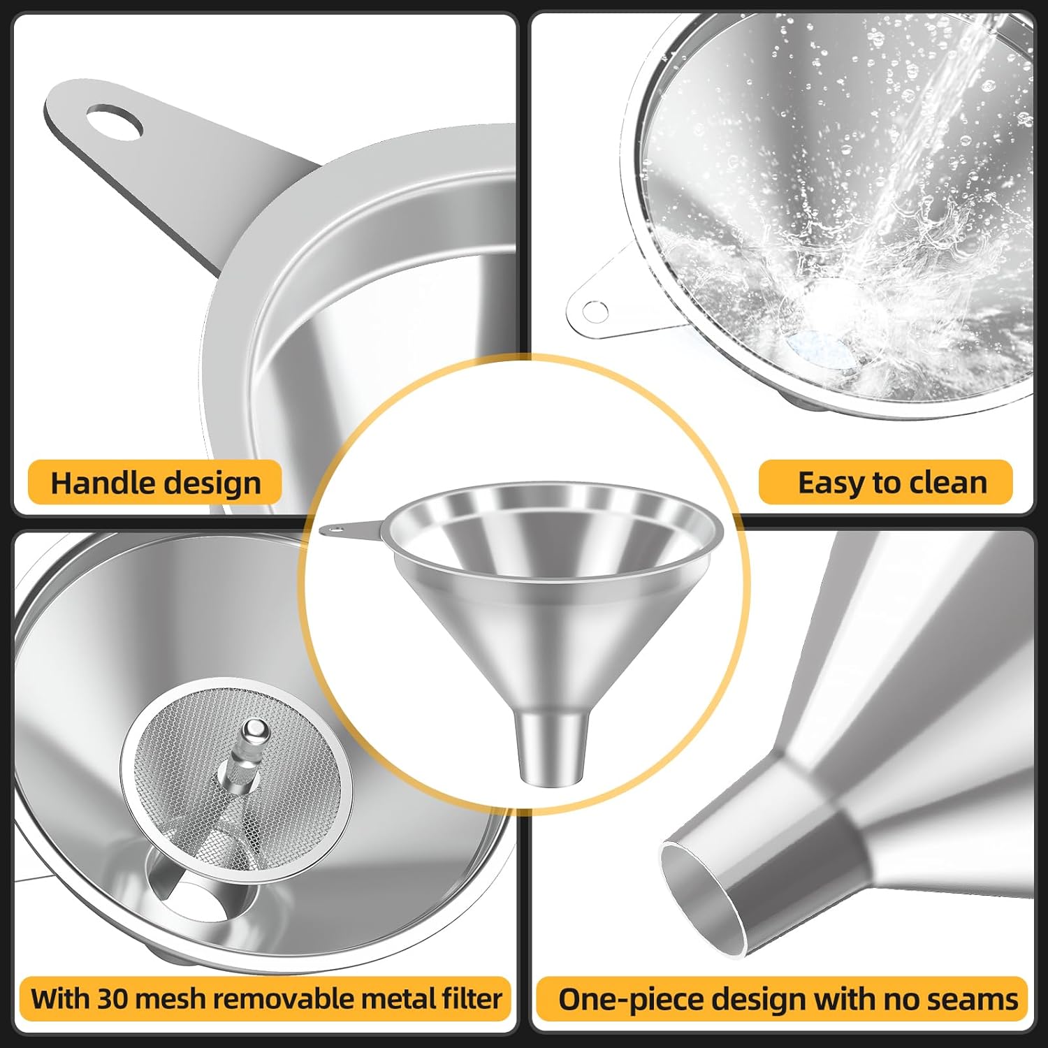 - Ergonomic Design with Side Handle – Each funnel features a sturdy side handle for easy holding and stability during pouring, preventing spills and messes in the kitchen