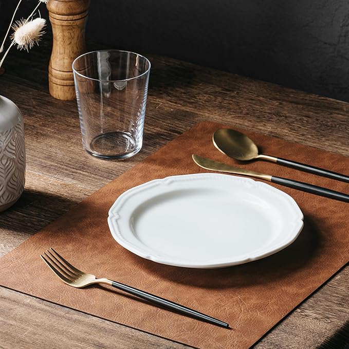 - [Reversible Dual-Color Design] Crafted from luxurious and durable faux leather, DOLOPL placemats feature a reversible color design that adds an elegant touch to your dining table. Switch sides to match any mood, season, or décor—one set offers two stylish looks while saving space and money. Perfect as fall placemats to bring warm seasonal vibes, or for everyday meals and special occasions, these table placemats provide lasting protection and retro appeal.