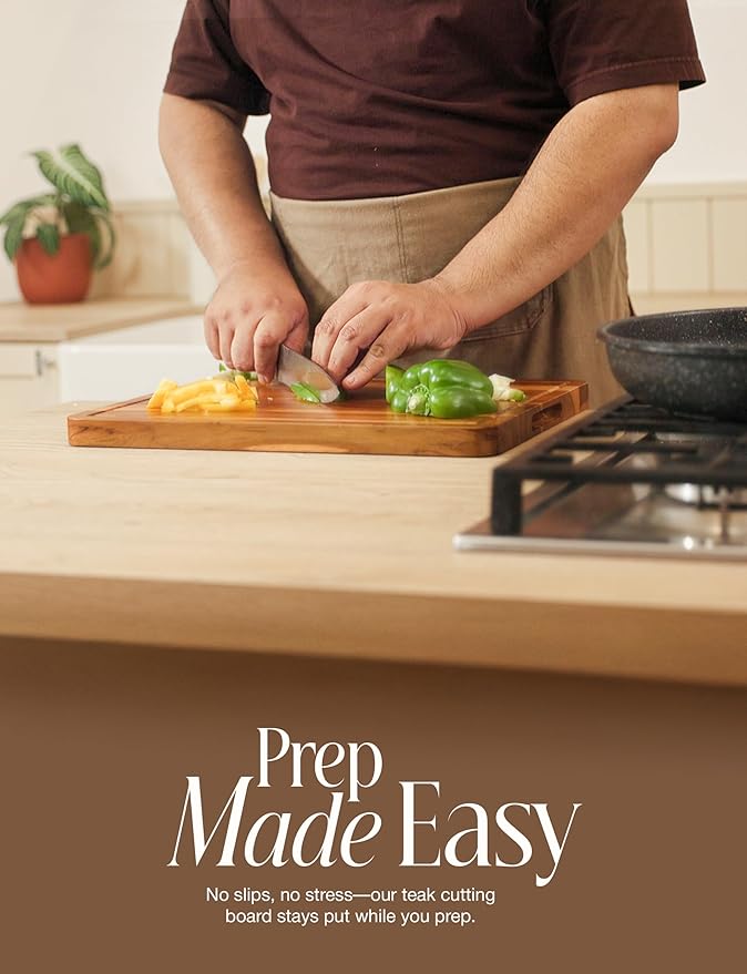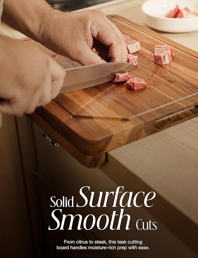 - Natural Teak Wood: Made from premium teak wood cutting board material, this durable surface resists moisture and is ideal for daily use. A high-end wooden cutting board that brings function and natural elegance to your kitchen