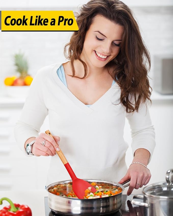 Pack of 4 Silicone Cooking Utensils Set, Non Stick Solid Spatulas and Heat Resistant Slotted Spoons with Wooden Handle, Ideal Wood Kitchen Utensils Set for Frying,Serving,Turning,Stirring (RED)