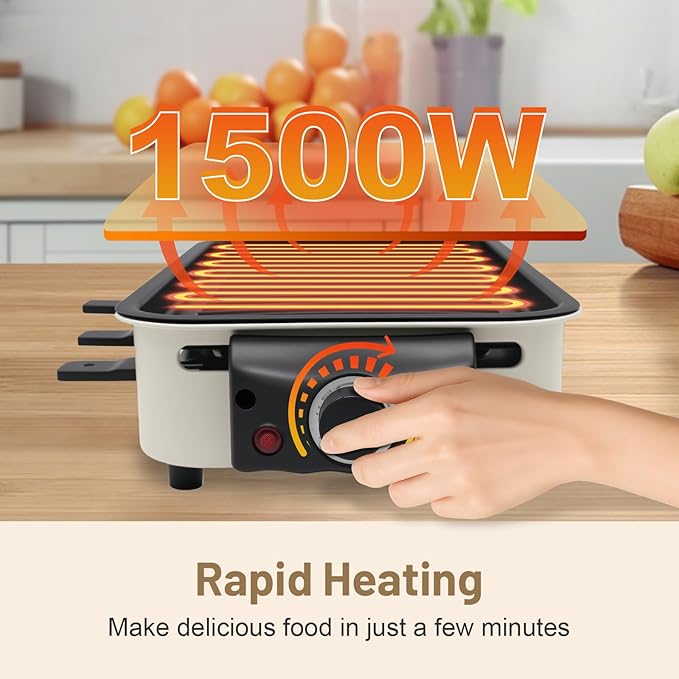 - Quick Heating: This 1500W smokeless indoor grill reaches grilling temp in minutes. Adjust temp with a knob; it auto-cools to prevent burning. Faster, less smoky than charcoal, and convenient—cook anywhere with electricity.