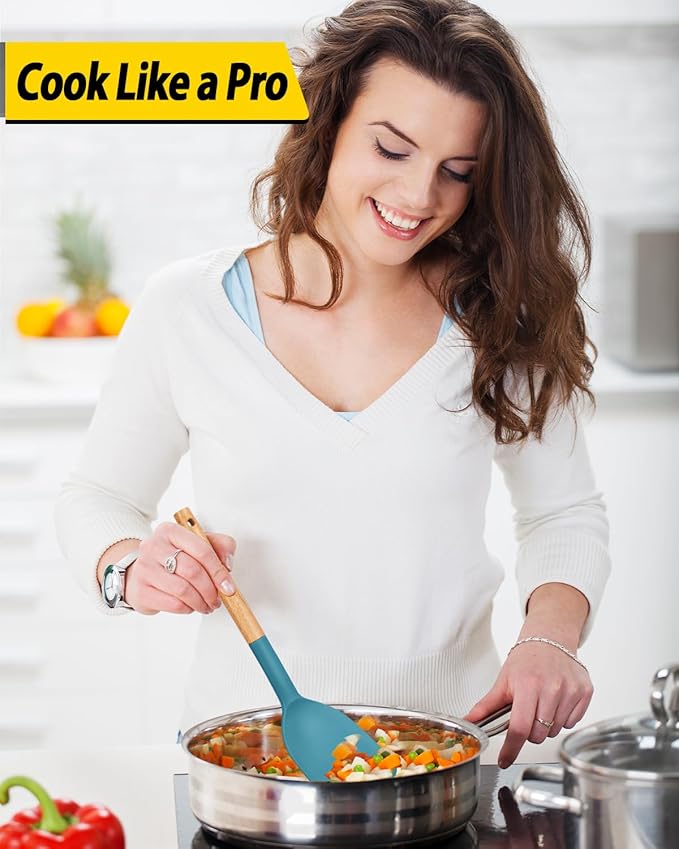 Pack of 4 Silicone Cooking Utensils Set, Non Stick Solid Spatulas and Heat Resistant Slotted Spoons with Wooden Handle, Ideal Wood Kitchen Utensils Set for Frying,Serving,Turning,Stirring (BLUE)