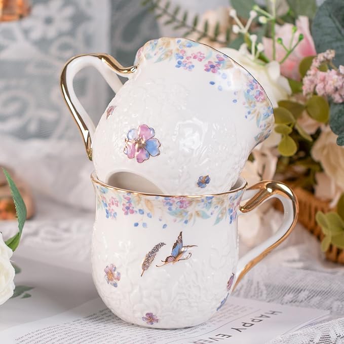 - 【Elegant Aesthetics】Featuring intricate embossed floral motifs that create a lifelike, three-dimensional "Secret Garden" effect, transforming this ceramic coffee mugs set into a handheld work of art. The gilded rim and handle elevate its luxurious appeal, adding sophistication to your daily rituals.Not suitable for microwave, oven, or dishwasher use.