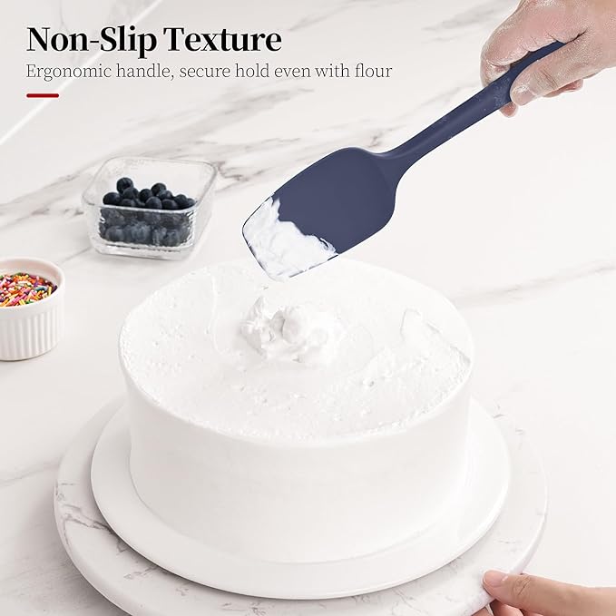 - [Comfort-Grip Handle - Secure Hold & Effortless Control] Designed for effortless handling, our cooking spatulas features an ergonomic soft-grip handle that stays secure even with wet or oily hands. The textured non-slip surface ensures precise control during extended mixing, stirring, or flipping—minimizing hand strain. A balanced weight distribution provides stability for delicate tasks like frosting cake. Made with full heat-resistant silicone, it keeps your hands cool when handling hot foods.