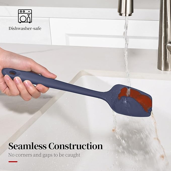 - [Seamless Design & Dishwasher Safe & Easy Storage] This baking spatula's smooth surface keeps food from sticking, so messy ingredients like caramel or melted cheese wash off easily. Made as semless construction, there are no hidden spots for food to get stuck. It's tough enough for daily dishwasher use, and the handy loop makes storage simple and keeps your kitchen tidy. Whether you're scraping peanut butter or mixing batter, cleanup takes seconds—just rinse and go.