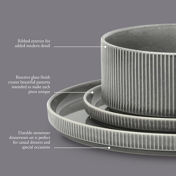 Gibson Elite Solana Coast 12 Piece Stoneware Reactive Glaze (Service for 4) Ceramic Plates and Bowls Modern Shape Embossed Dinnerware Set - Black