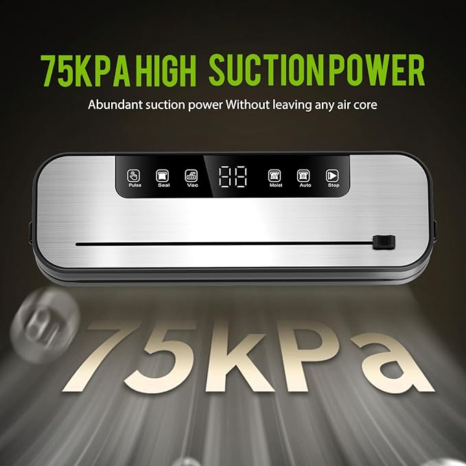 - 75Kpa Strong Suction: This vacuum food sealer has 75Kpa strong suction, which can provide fast and powerful air extraction to ensure that the food is completely vacuum sealed. Even moist or juice-rich food can be accurately sealed to avoid air and moisture intrusion, prevent food oxidation, reduce waste. Comes with 10 vacuum sealing bags, suitable for daily storage of various ingredients such as meat, vegetables, and dried fruits.