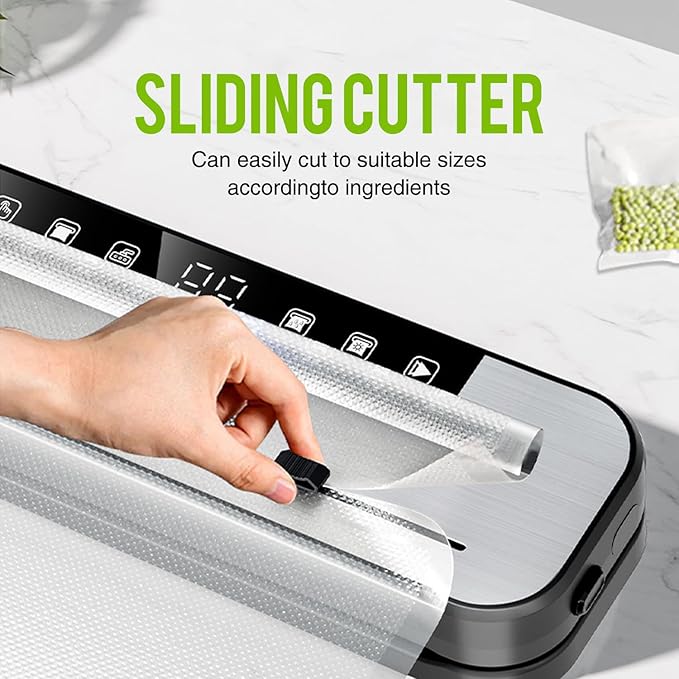 - Widened Seal and 11.8" Sealing Length: Vacuum packing machine has a 5mm widened sealing line and an 11.8" extended sealing strip design, which is not only suitable for the sealing and processing of bulk ingredients, but also can efficiently complete batch sealing tasks. The built-in sliding cutter does not require additional scissors, and the vacuum bag can be accurately cut to the required length with a single slide.
