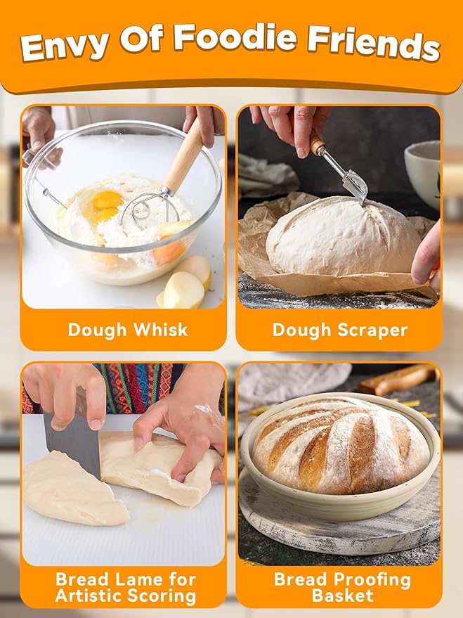 - ALL-IN-ONE SOURDOUGH STARTER KIT INCLUDED:Everything for artisan bread: 10" Round Banneton Proofing Basket with liner, dough whisk, scraper, bread lame +5 blades, non-stick silicone bread sling, heat-resistant pot ear clips, and proofing cloth. No extra purchases needed!