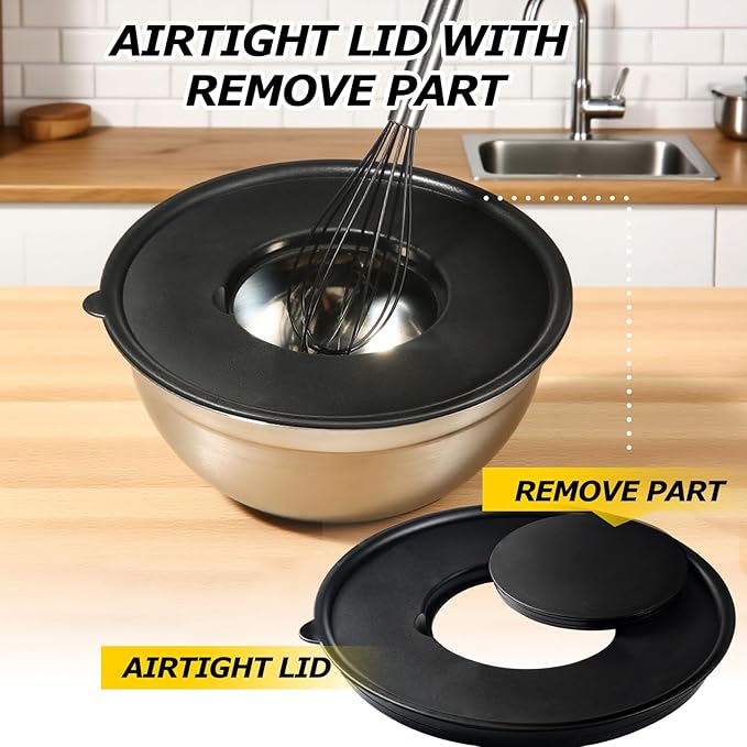 - 【Airtight Lids & Versatile Grater Attachments】This mixing bowl set includes airtight lids to keep ingredients fresh and prevent spills. One bowl features a removable inner lid for easy addition of contents and compatibility with blenders. Plus, it comes with three grater attachments for slicing, grating, and shredding directly into the bowl
