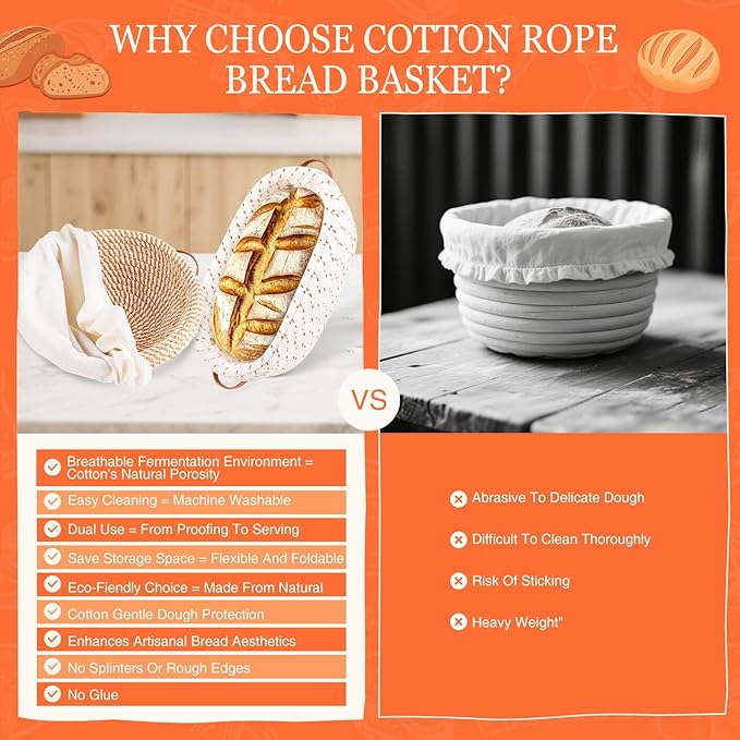 - 🥖THOUGHTFUL WOVEN BASKETS DESIGN FOR PERFECT PROOFING - Food-Grade Cotton Material For Safe Proofing. The slightly textured surface of the woven material also leaves a beautiful pattern on the crust, adding an artisanal touch to your homemade bread that’s sure to impress. The woven structure of the cotton rope basket provides just the right amount of tension and air circulation needed for perfect dough proofing. It’s also lightweight and easy to store—fold it gently when not in use, or hang it up as a decorative accent that showcases your love for baking.