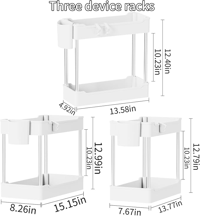 - 3 Pack Under Sink Organizer with Bonus Hanging Cups – Our under sink organizers and storage set includes 3 units, unlike most 2-pack competitors. Ideal for organizing kitchen and bathroom cabinets, each unit features a unique hanging cup attachment to hold sponges, brushes, or small toiletries. More capacity means better organization for tight spaces.