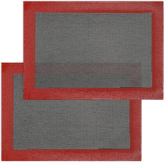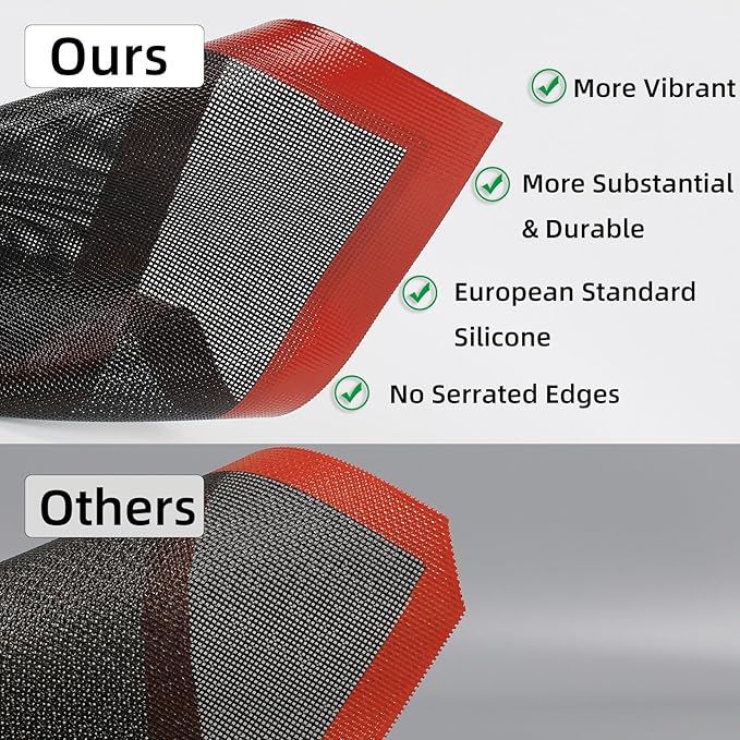 - ✅ 【SILICONE AIR MESH MAT, ELEGANCE & BEAUTY】 Perforated mesh creates evenly browned, golden bottoms with beautiful crisping marks, ensuring your baked creations come out perfectly golden and unmistakable crunch every time. Its sleek black design with red trim adds a refined, professional look to any baking setup, turning every batch into a bakery-worthy creation.