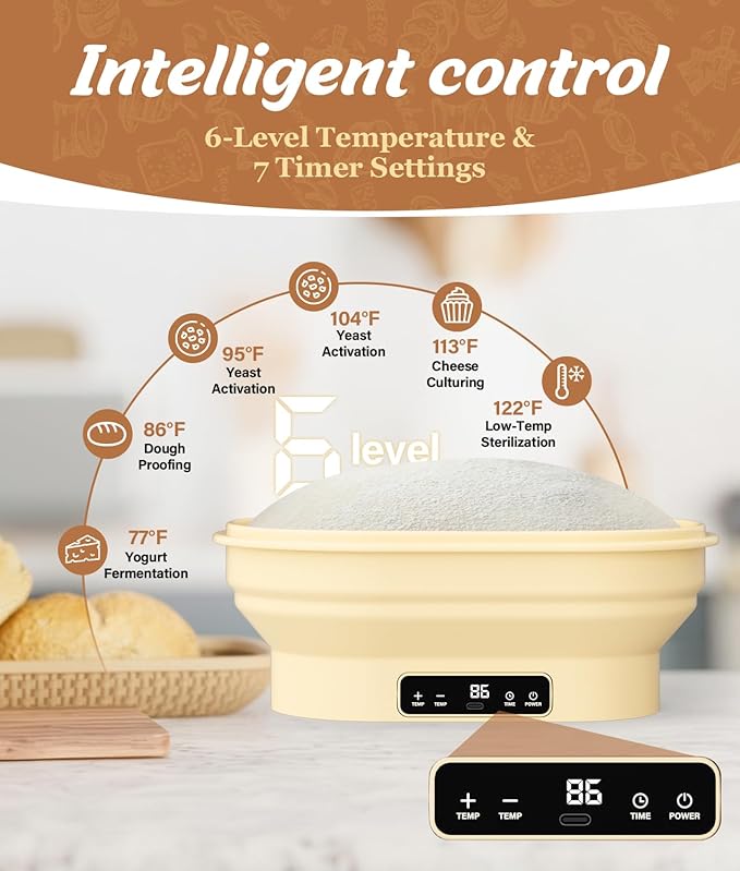 - Fast & Precise Temperature Control: This electric proofing basket features a 6-level real-time temperature display (77°F-122°F) and 7 adjustable timer functions, ensuring exact monitoring of the fermentation environment to prevent over or under-proofing. The transparent anti-fog lid allows you to check dough progress without frequent opening, maintaining optimal stability.