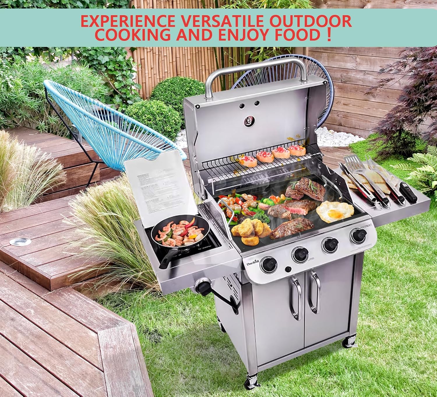 - Versatility: Experience versatile outdoor cooking and enjoy the benefits of a true flat griddle on your outdoor gas grill. A culinary powerhouse that revolutionizes your cooking experience both indoors and outdoors. perfect for sizzling crispy bacon, grilling juicy burgers and savory hot dogs, or even steaming and stir-frying multiple dishes simultaneously—no more waiting around for your meals!