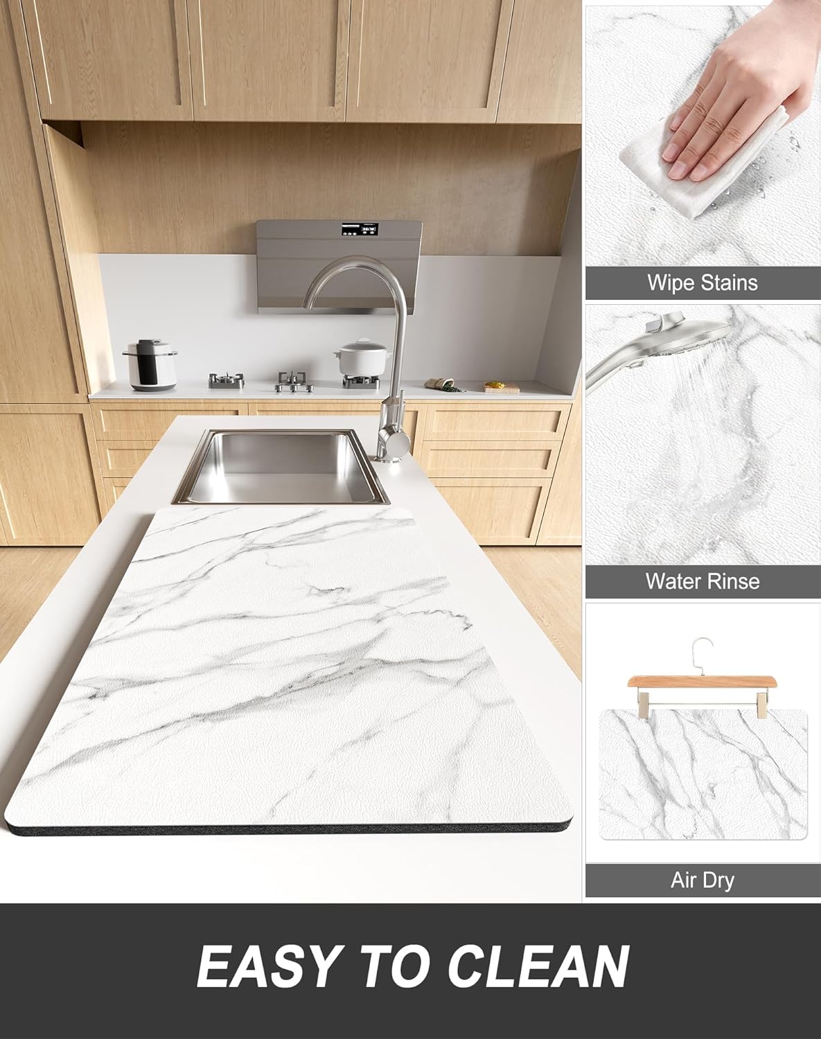 Rnivvi Dish Drying Mat for Kitchen Counter, 12 x 19" Cute Marble Super Absorbent Draining Pad, Non-Slip Heat Resistant Coffee Bar Mats for Coffee Machine Station Accessories, White Dish Rack Pad