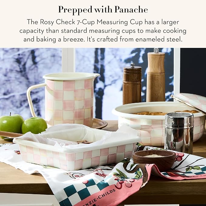 MACKENZIE-CHILDS Enamel Measuring Cup, Cute Measuring Cup with Pour Spout, 7-Cup Capacity, Pink-and-White Rosy Check