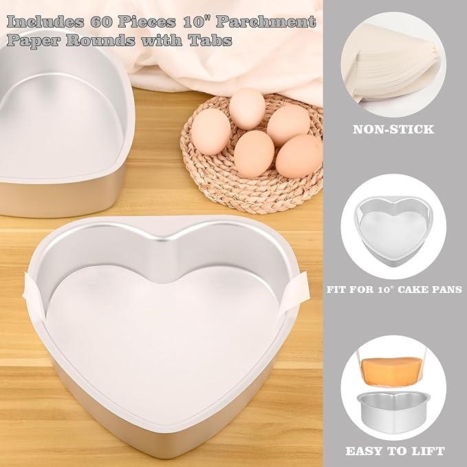 - Heart Cake Pan Set: 2 pack heart baking pan, size: 10 x 2.5 Inch.Integrated molding process to prevent leakage. The 60 count of parchment paper that come with it make the demoulding job much easier and are perfect for baking enthusiasts and beginners.