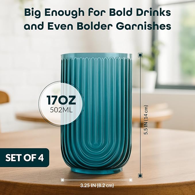 - 🍹ELEGANT DESIGN: Art deco-inspired blue glass tumblers featuring a distinctive arch pattern that adds sophistication to any table setting. Tumblers are perfect for a variety of drinks, including whiskey, cocktails, beer, wine, margaritas, iced tea, coffee, smoothies, and everyday beverages. These drinking glasses work for both casual dinners and elegant parties, making them a perfect addition to your vintage or modern drinkware collection.