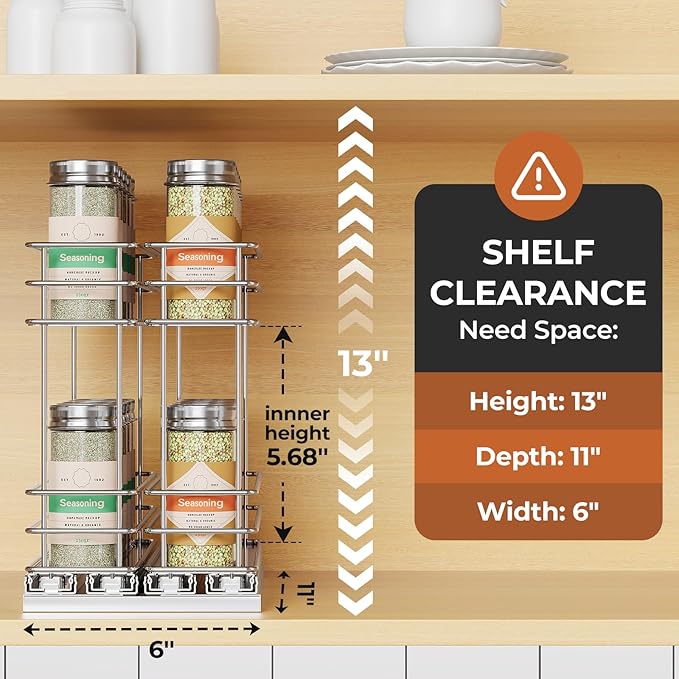 - 【Easy to Install】This vertical spice rack pull out fits almost all cabinets. Please measure your cabinet first, We offer a easy-to-follow instruction and a step-by-step video, you can easily assemble this spice rack for cabinet in minutes.