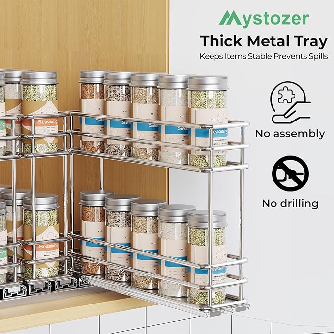 - 【Dual Slide Rails】Unlike other under cabinet spice rack that only have one slide rail, Mystozer vertical spice rack has two slide rails so you can pull out each layer independently.This unique design not only makes the spices in each layer more stable when sliding out, but also perfectly organized for your spices.