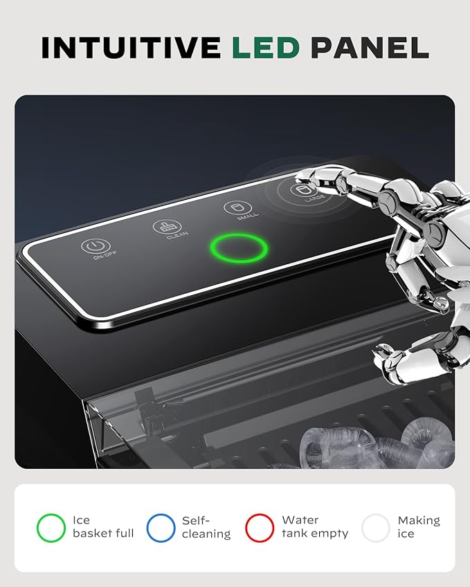 - Intuitive LED Touch Control Panel: The easy-to-use LED touch panel features four clear indicators—white for ice-making, red for low water, green for a full basket, and blue for self-cleaning—allowing you to monitor and control the countertop ice maker effortlessly at a glance.