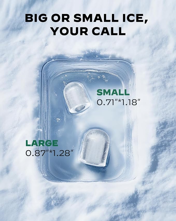 - Fast & Efficient Ice Production: Get 9 bullet-shaped ice cubes in just 6 minutes and up to 26 lbs per day, ensuring a steady ice supply for cocktails, cold drinks, or food preservation. Choose between two ice sizes to suit different beverages and occasions.