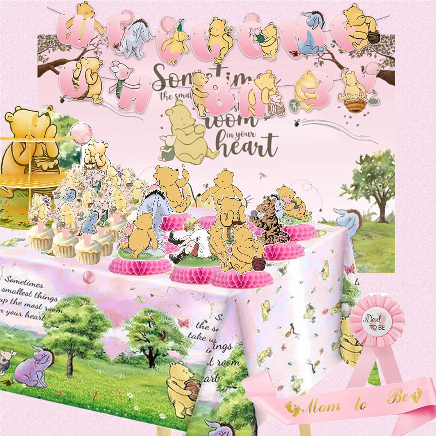 - Included Components : 2 pcs OH baby welcome banner, 1pcs backdrop, 1pcs 3 Tier Winnie Dessert Holder,1pcs Winnie tablecloth, 1pcs"Mommy to Bee" Sash,1pcs"Daddy to Bee"Tinplate Badge,1pcs Winnie cake topper and 12 pcs Winnie cupcake toppers,9Pcs Winnie Honeycomb Centerpieces 2 pcs OH baby welcome banner, 1pcs backdrop, 1pcs 3 Tier Winnie Dessert Holder,1pcs Winnie tablecloth, 1pcs"Mommy to Bee" Sash,1pcs"Daddy to Bee"Tinplate B… See more