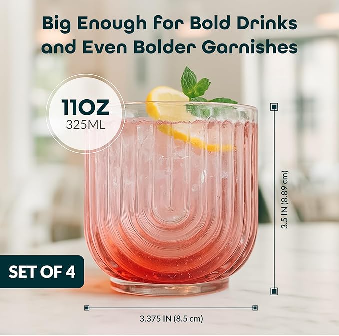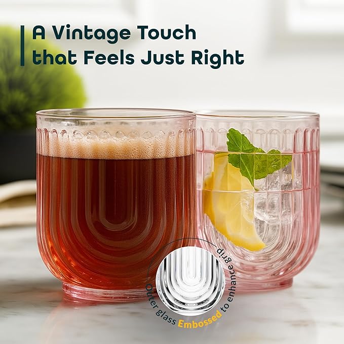 - 💖ELEGANT DESIGN: Art Deco U-shaped pattern in pink glass creates a stunning vintage-inspired look perfect for any home bar or dining setting. These blush pink double old-fashioned whiskey glasses are perfect for a variety of alcohol beverages including spirits neat or on the rocks, cocktails, bourbon, scotch or any other soft cold drink like water and juice.