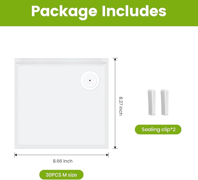 - Reusable Valve Bags:FEPPO's vacuum bags keep food fresh 6x longer with patented air valves! Leakproof & dishwasher-safe. Perfect for meats, veggies & meal prep. Includes 30 PCS M Size (8.3"×8.7") bags.
