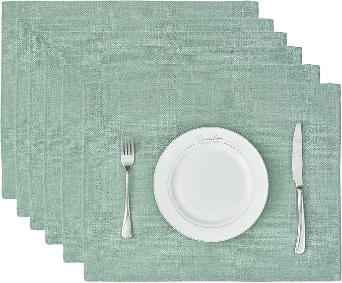 BALCONY & FALCON Placemats Set of 6 Faux Linen Cloth Place Mats Washable Waterproof Wrinkle Resistant Table Placemats for Dining Kitchen Farmhouse Indoor & Outdoor Use(Celadon Green, 13.8”x 17.7”