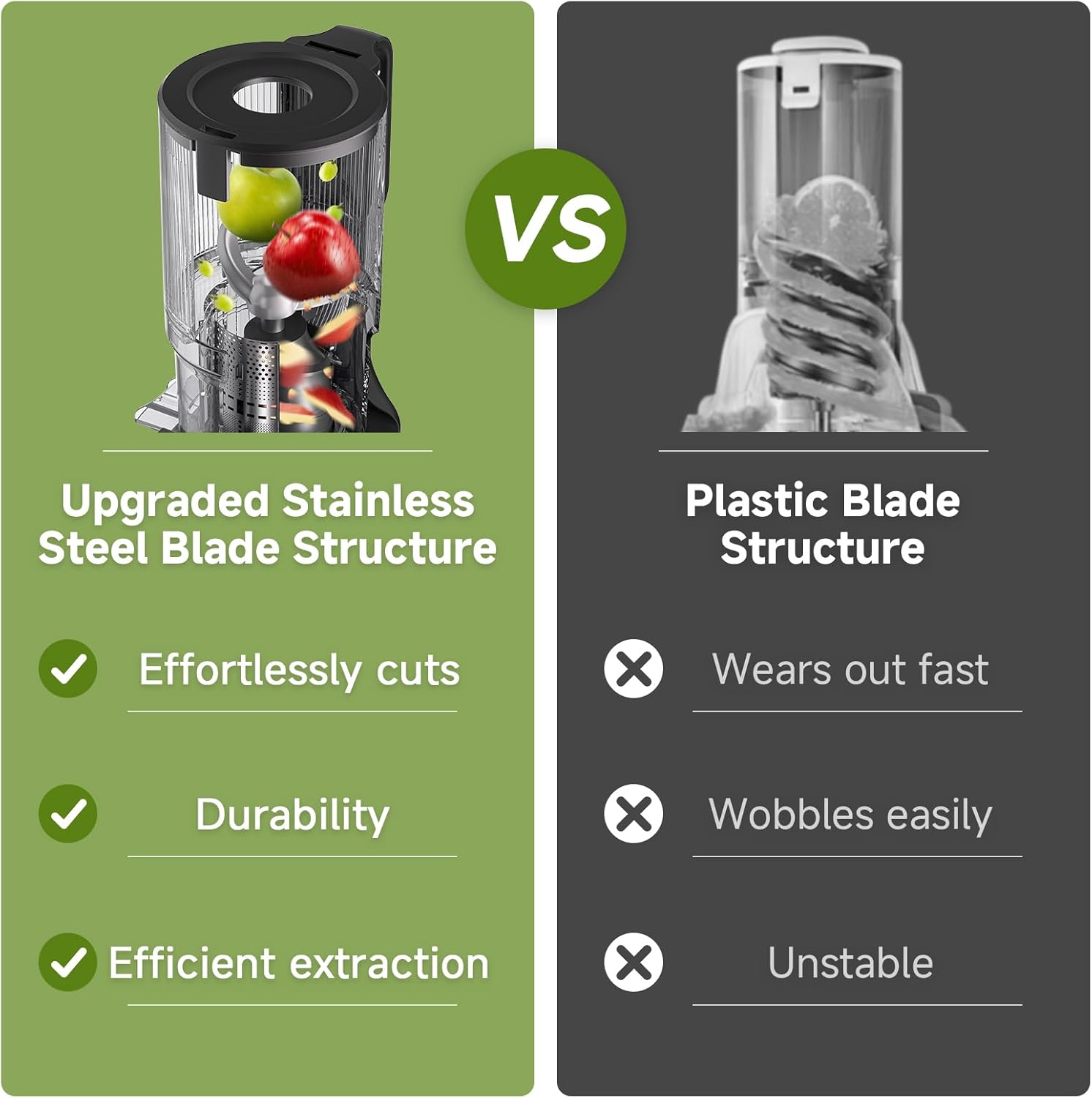 - ăMaximum Juice, Minimum WasteăThe upgraded auger applies high pressure at a low speed, boosting juice yieldâespecially from hard fruits and vegetables. Less waste, more nutrition, and better value in every glass.