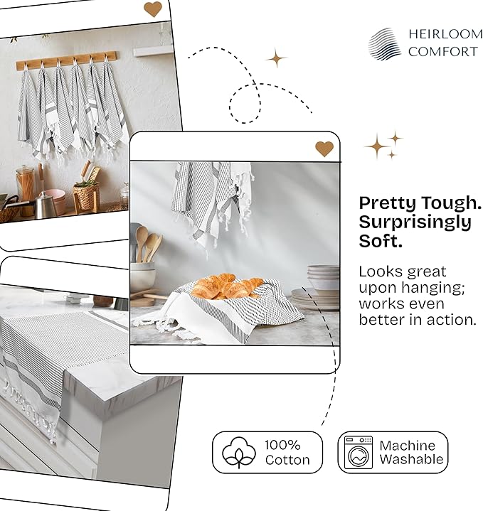 - PREMIUM 100% COTTON MATERIAL: Our Turkish kitchen towels are crafted from high-quality cotton for superior softness, absorbency, and lasting durability.
