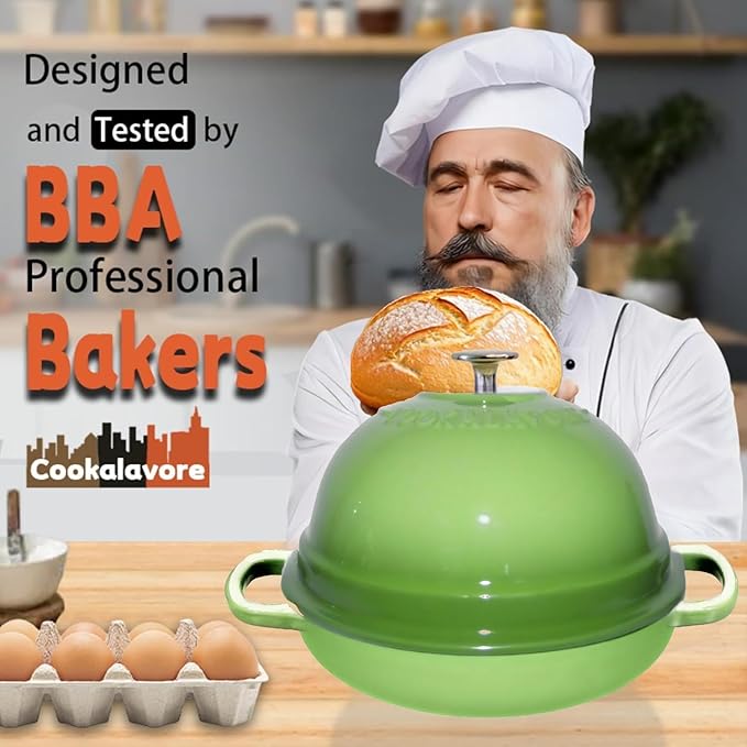 - 🍞GAME-CHANGING INNOVATION:Elevate your baking game with the Cookalavore bread oven!Its innovative dome design ensures optimal steam circulation,guaranteeing that sourdough rises perfectly and develops a mouthwatering golden crust with each bake.13.8" diameter with handles,10.6" without handles,7.6" high with the knob,6 QT Bread oven equipped with Silicone Baking Liner(21"x8.7"),recipes help easily master baking steps,takes your baking game next level.Say hello to effortless baking perfection!