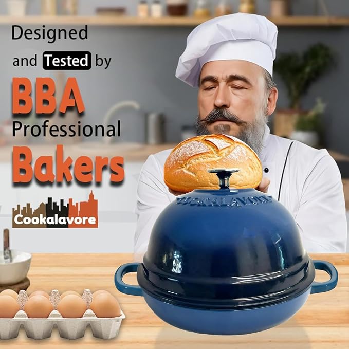 - 🍞GAME-CHANGING INNOVATION:Elevate your baking game with the Cookalavore bread oven!Its innovative dome design ensures optimal steam circulation,guaranteeing that sourdough rises perfectly and develops a mouthwatering golden crust with each bake.13.8" diameter with handles,10.6" without handles,7.6" high with the knob,6 QT Bread oven equipped with Silicone Baking Liner(21"x8.7"),recipes help easily master baking steps,takes your baking game next level.Say hello to effortless baking perfection!