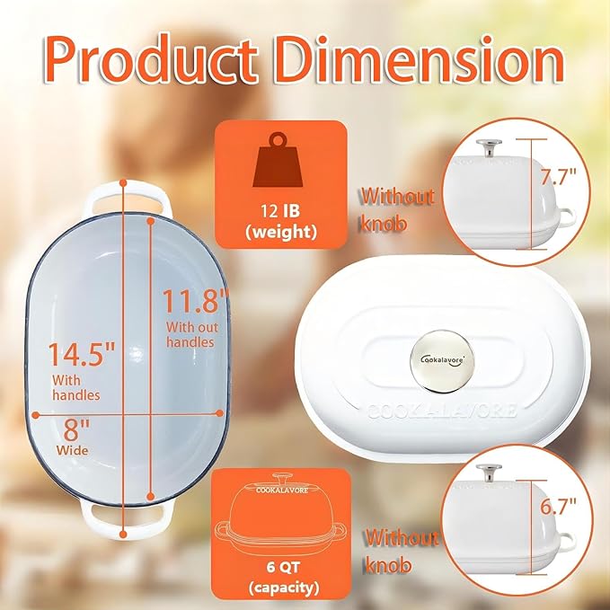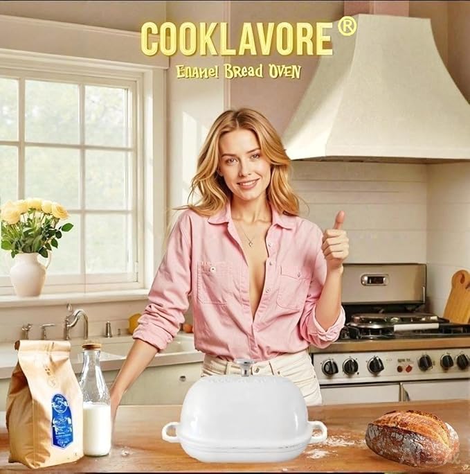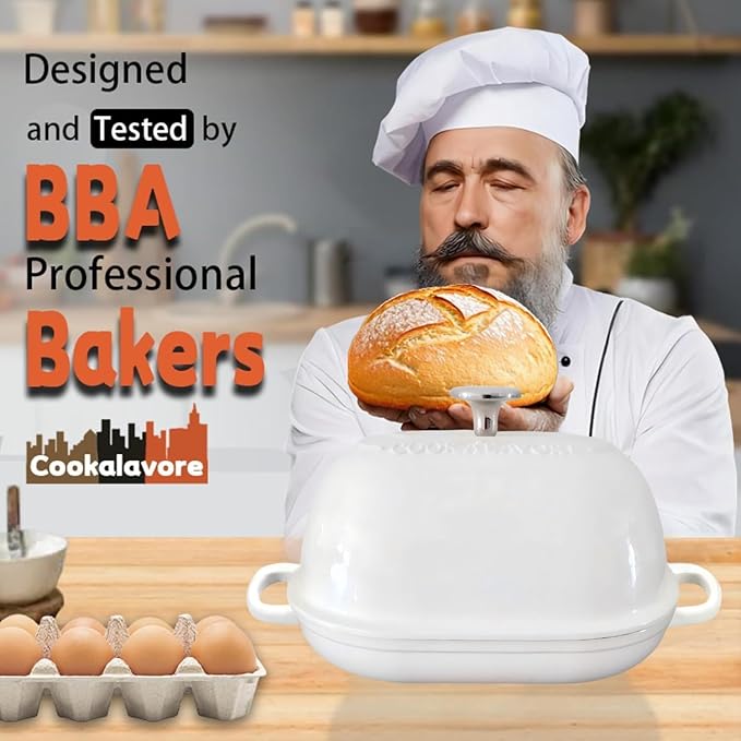 - 🍞GAME-CHANGING INNOVATION:Elevate your baking game with the Cookalavore bread pan!Its innovative oval dome design ensures optimal steam circulation,guaranteeing that sourdough rises perfectly and develops a mouthwatering golden crust with each bake.14.5" long with handles,11.8" without handles,7.5" high with the knob,6 QT Bread oven equipped with Silicone Baking Liner(21"x8.7"),recipes help easily master baking steps,takes your baking game next level.Say hello to effortless baking perfection!