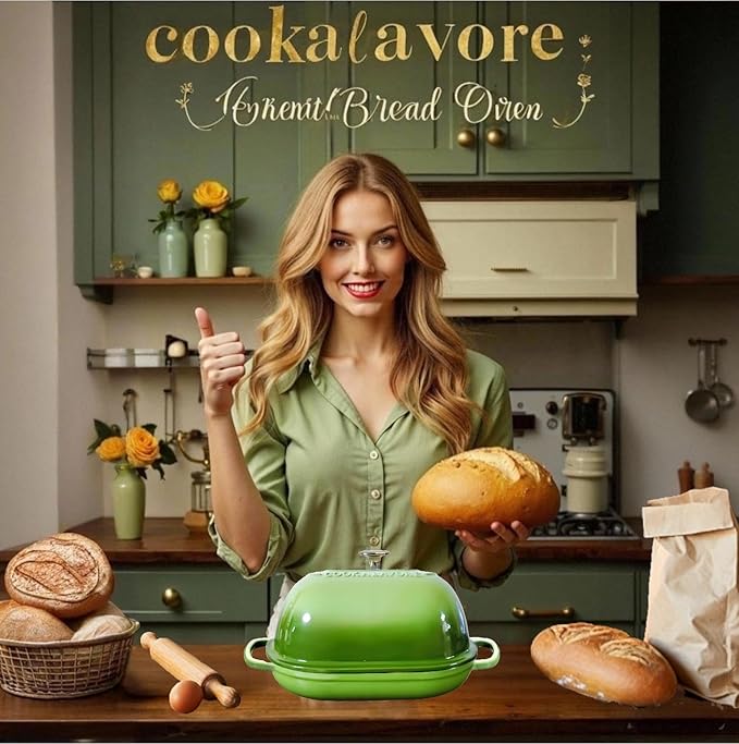Cast Iron Bread Oven,6 QT Bread Oven,Thick Enameled Loaf Pan with Lid,Bread Pans for Homemade Bread,14.5"Dutch Oven for Bread Baking,Dutch Oven-with Silicone Baking Mat&Recipe,Gifts for Family,Green