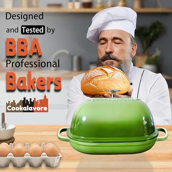 - 🍞GAME-CHANGING INNOVATION:Elevate your baking game with the Cookalavore bread pan!Its innovative oval dome design ensures optimal steam circulation,guaranteeing that sourdough rises perfectly and develops a mouthwatering golden crust with each bake.14.5" long with handles,11.8" without handles,7.5" high with the knob,6 QT Bread oven equipped with Silicone Baking Liner(21"x8.7"),recipes help easily master baking steps,takes your baking game next level.Say hello to effortless baking perfection!